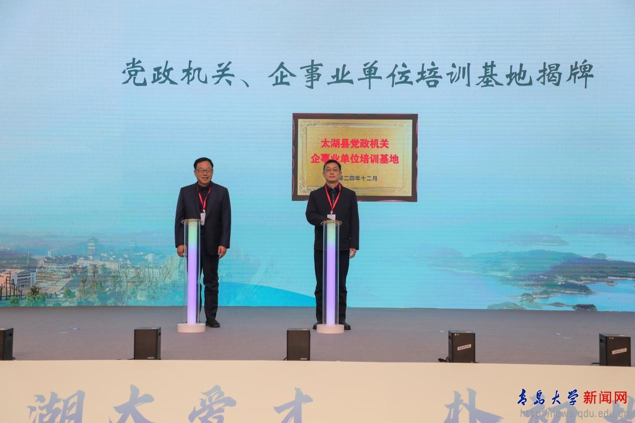 刘恩贤代表学校与太湖县人民政府签订校地合作协议。双方代表共同为高校实习基地(就业工作站),党政机关、企事业单位培训基地揭牌。