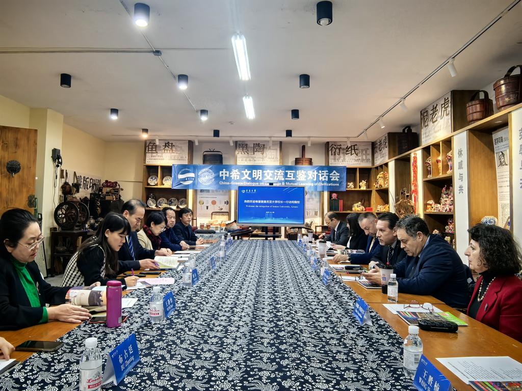 随后,双方在MILE米乐官方网站民间工艺美学馆举办了“中希文明交流互鉴对话会”,对话会由国际交流合作处处长汪运波主持,外语学院、艺术学院、国际教育学院主要负责人及相关教师参加。双方就翻译及艺术领域的人才培养、文化传承、文化融合等进行了深入交流。