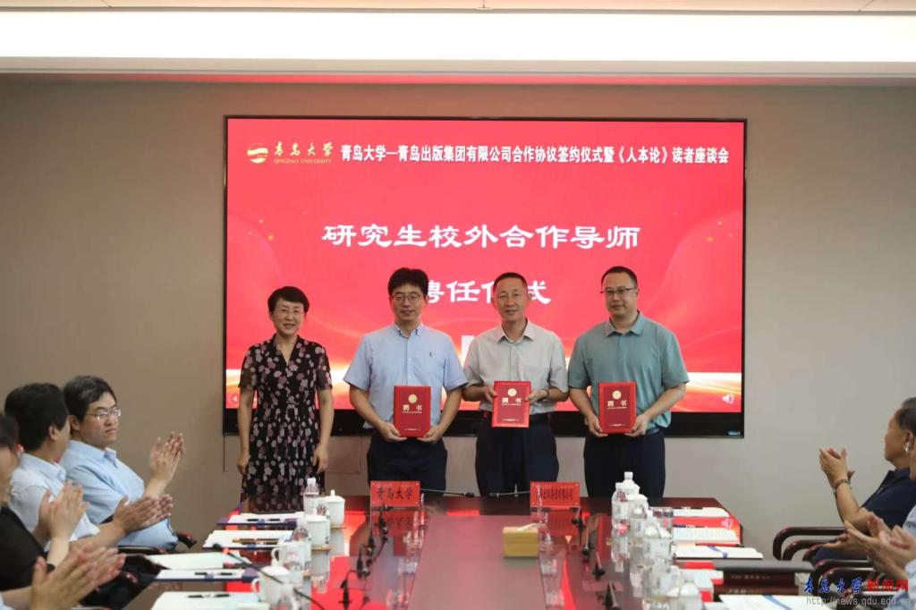 卞建华分别为张性阳、青岛出版社日本文化中心总编辑杨成舜、青岛出版社地方文化中心总编辑刘坤颁发了研究生校外合作导师聘书。