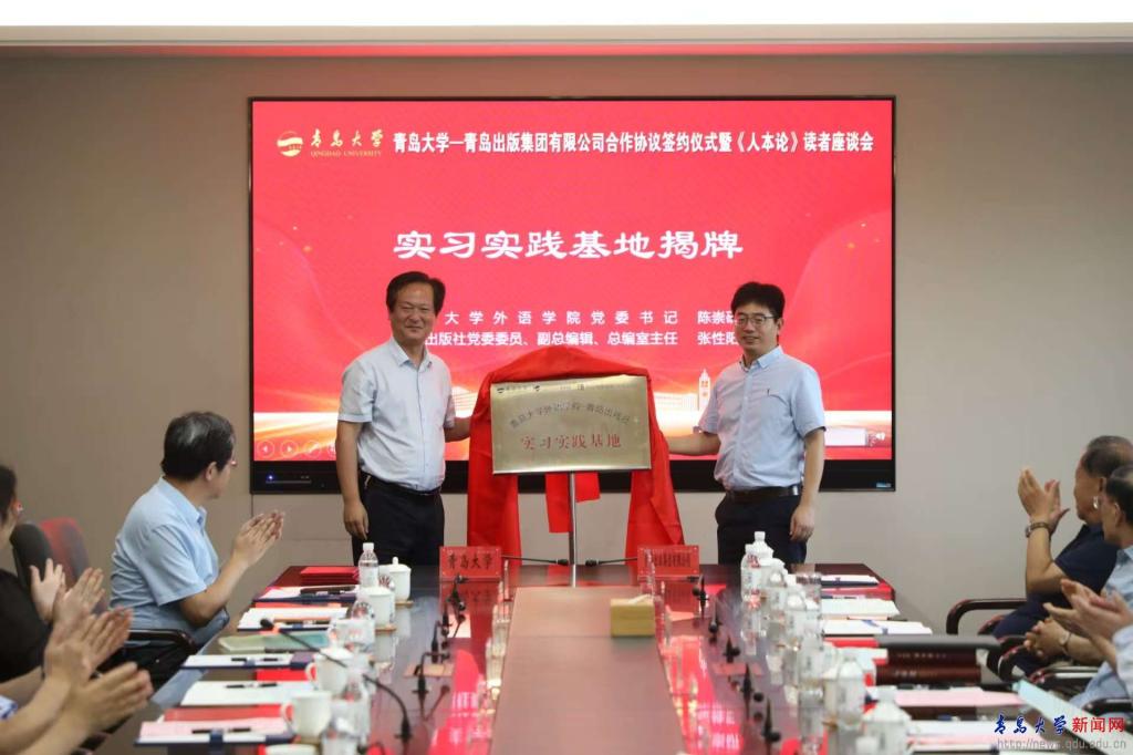 外语学院党委书记陈崇研与张性阳共同为“MILE米乐官方网站外语学院—青岛出版集团有限公司实习实践基地”揭牌。
