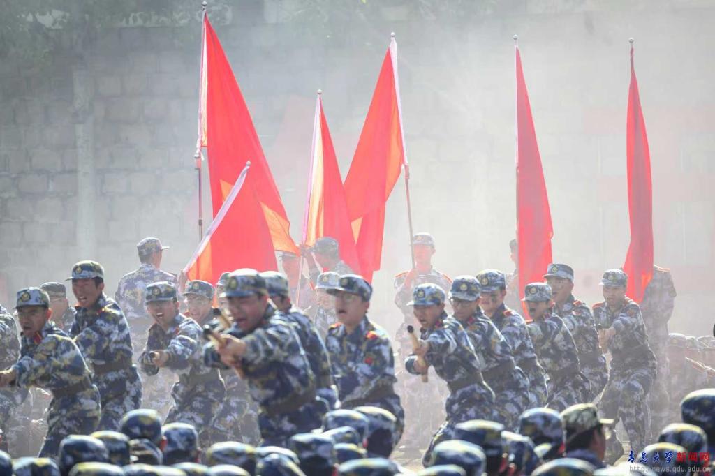 在“强国青年说”环节,辅导员王嘉伟动情讲述一个个心存大我、身许家国的故事,激励师生把个人的理想追求融入党和国家事业之中。在青春宣誓环节,巨幅党旗、国旗徐徐展开,献礼中华人民共和国成立76周年。“首战用我、用我必胜”“若有战、召必回”“愿以吾辈之青春,捍卫盛世之中华”铿锵有力的誓言响彻整个会场,点燃现场家国情怀。