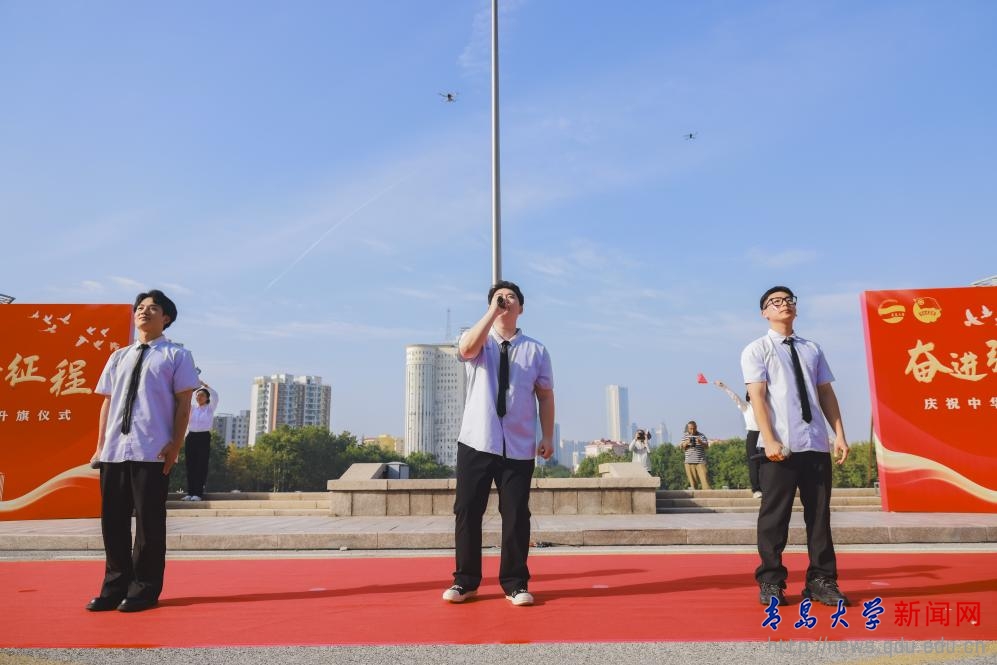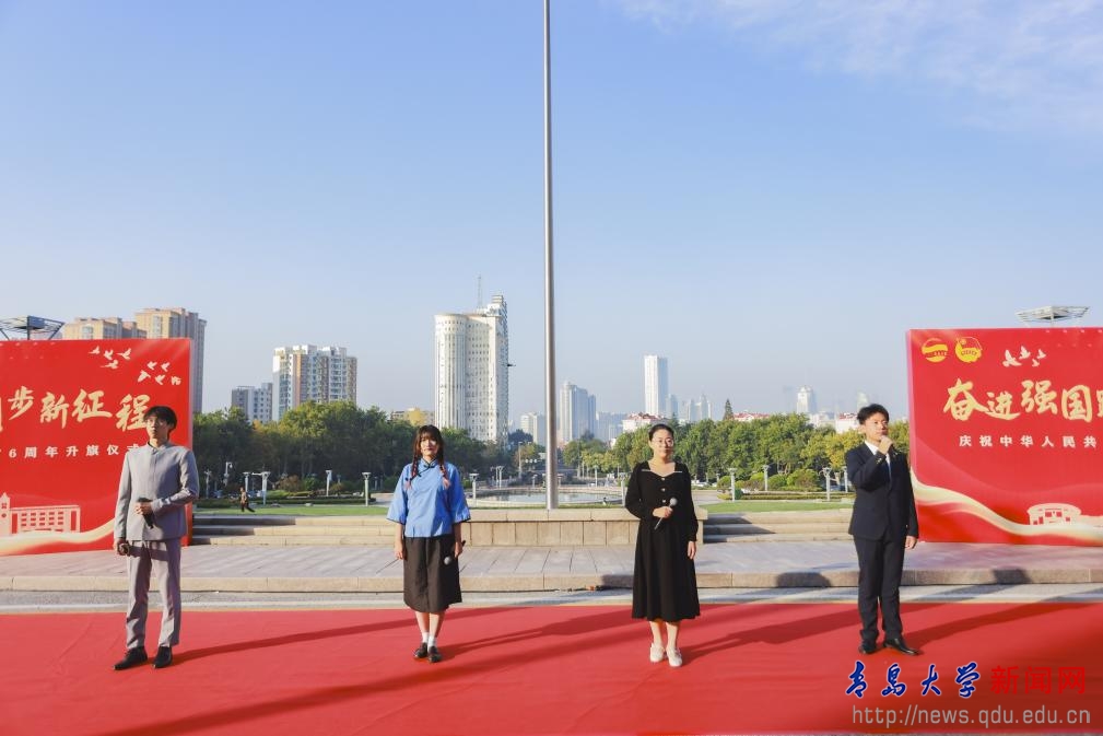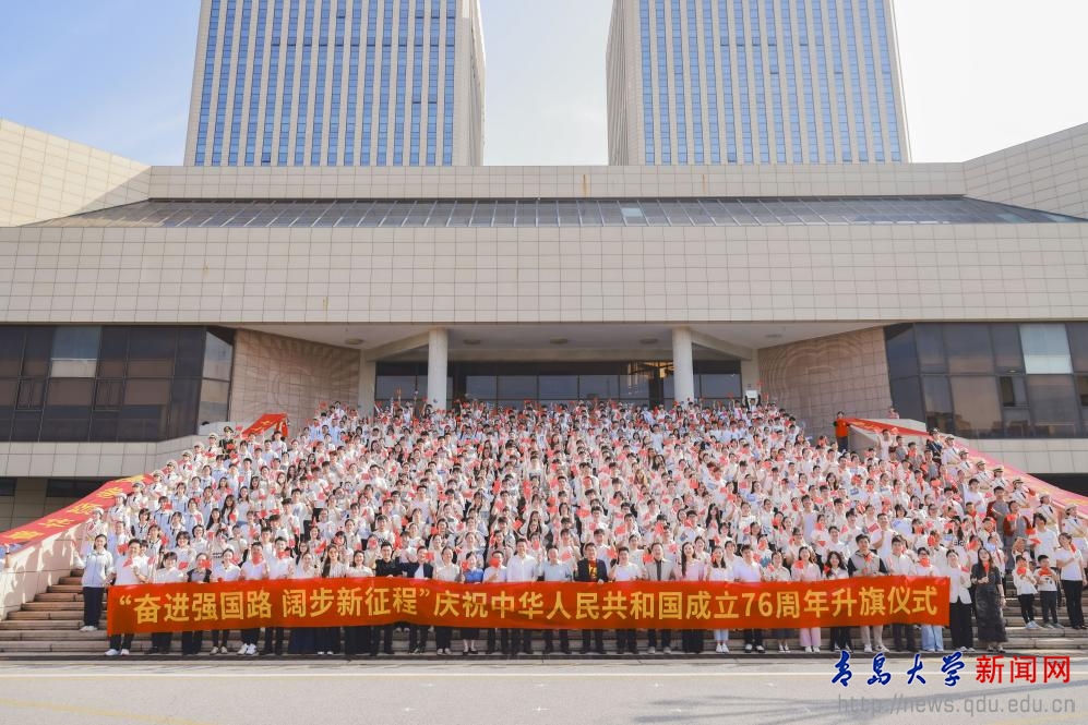 鲜红的国旗映衬下,青年学生代表用饱含热忱的青春话语,向祖国致以生日祝福。全体学生高举右拳,字字铿锵地立下 “奋进强国路 阔步新征程” 的青春誓言。全体师生挥舞着手中的国旗和校旗,共同唱响《红旗飘飘》,悠扬歌声传递着对祖国的无限热爱,现场洋溢着热烈温馨的氛围,尽显青大学子的赤诚与担当。
