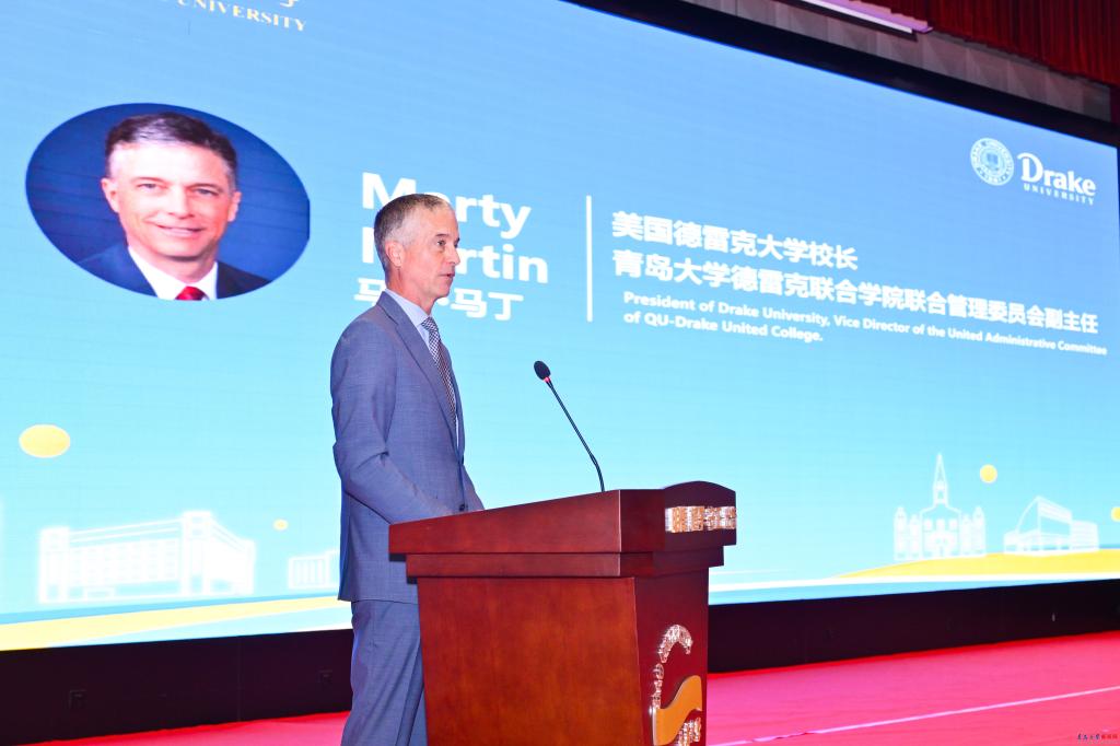 马蒂·马丁详细介绍了德雷克大学的国际化办学理念、历史沿革、人才培养目标和社会评价。他期望2025级新生在两校优质教育资源的联合培养下,提升个人专业素养,增强跨文化沟通能力,成长为拥有全球意识的国际化公民。