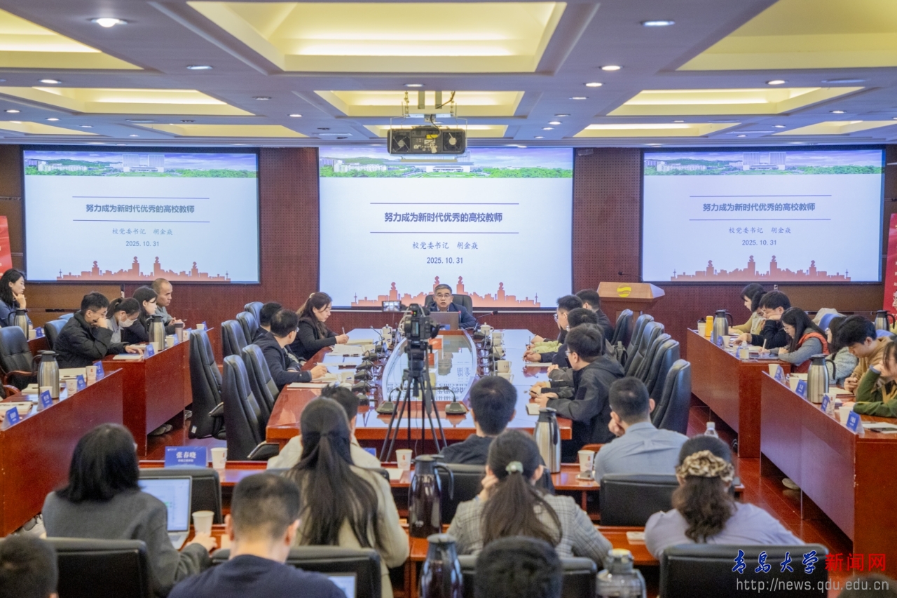 新闻网讯 10月31日上午,2025年新入职教师培训开班仪式暨书记思政课在办公楼407会议室举行。校党委书记胡金焱以“努力成为新时代优秀的高校教师”为题,为全体新入职教师作专题报告。校党委常委、副校长陈涛主持活动。