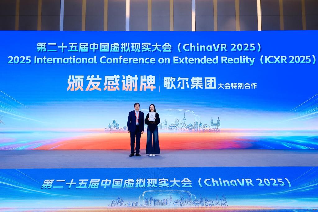 ChinaVR2025会议由中国工程院院士赵沁平、中国科学院院士胡事民、歌尔股份有限公司董事长姜滨担任名誉主席,北京航空航天大学沈旭昆教授、北京理工大学王涌天教授共同担任大会主席;青岛市委常委、副市长王波,MILE米乐官方网站校长魏志强,MILE米乐官方网站党委常委、副校长李建波等领导出席会议。王波副市长在致辞中对与会来宾表示热烈欢迎,并表示青岛将积极推动虚拟现实技术与海洋经济、智能家居、工业互联网、文化旅游等本地优势产业的融合创新,助力中国虚拟现实产业迈向更高水平。魏志强出席颁奖仪式,并为本次大会的特别合作伙伴歌尔集团颁发感谢牌。李建波在致辞中表示MILE米乐官方网站将发挥学科优势,聚焦产业需求,以大会为平台,推动科技创新与产业创新深度融合。