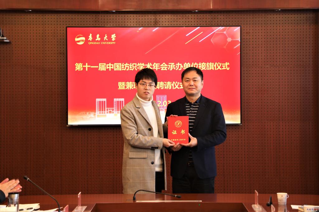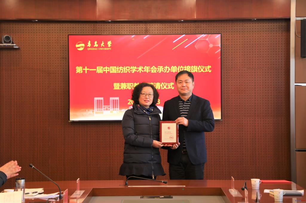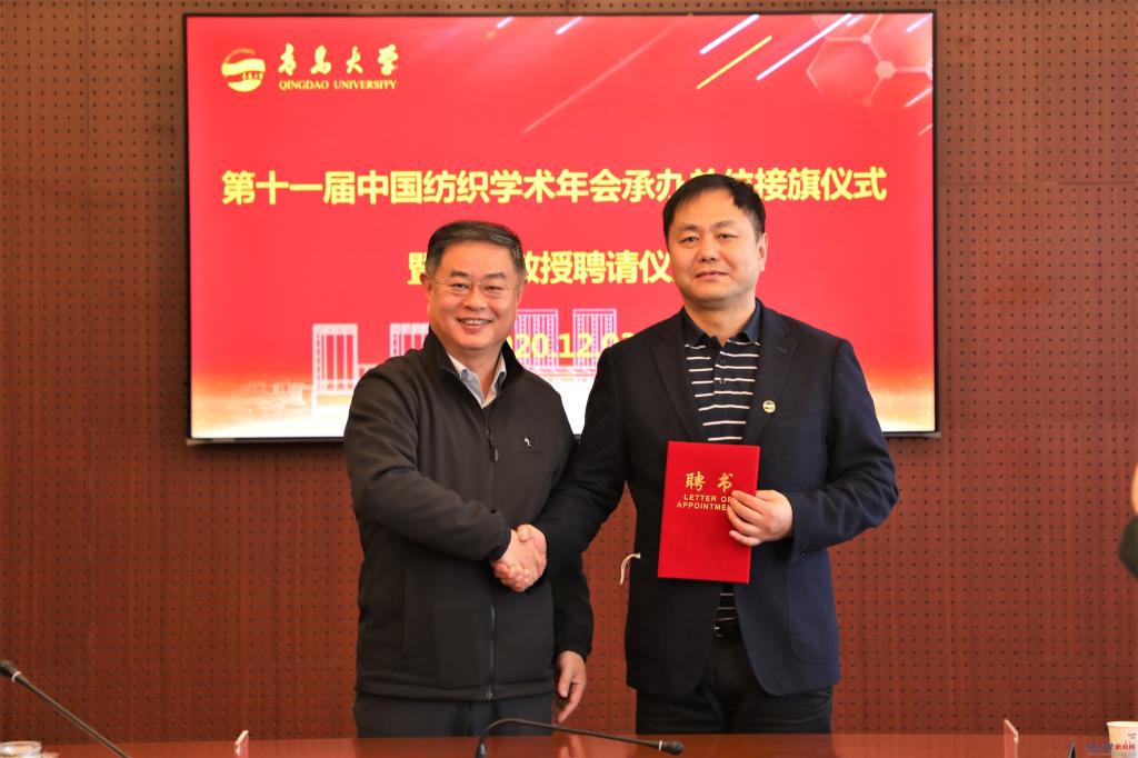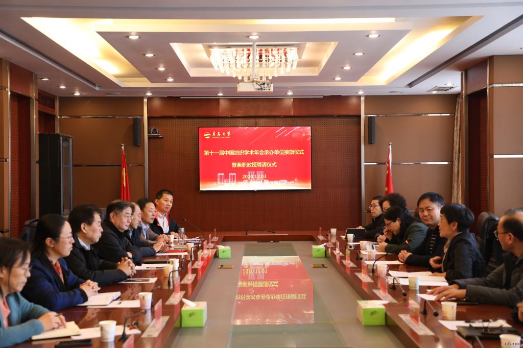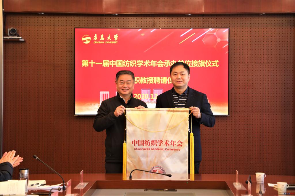 新闻网讯 12月3日,第十一届中国纺织学术年会承办单位接旗仪式在MILE米乐办公楼第五会议室举行。中国纺织工程学会理事长伏广伟、MILE米乐官方网站校长夏东伟出席接旗仪式。仪式由中国纺织工程学会副理事长尹耐冬主持。夏东伟代表学校从伏广伟手中接过中国纺织学术年会旗帜,纺织学术年会的“青大时间”正式开启。