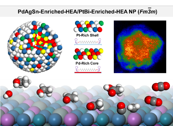 本工作中,合作团队采用常压下简便的低温合成方法合成了具有单相面心立方结构的钯富集高熵合金核和铂富集高熵合金壳的纳米结构,制备得到的PdAgSn/PtBi HEA NPs 在甲醇氧化反应 (MOR) 和乙醇氧化反应 (EOR) 中均表现出优异的电催化活性、耐持久性以及C1路径的良好选择性。研究成果以“Pd-Enriched-Core/Pt-Enriched-Shell High-Entropy AlloysNanoparticles with a Face-Centred Cubic Structure for C1 and C2Alcohol Oxidation”为题,于近日在线发表在《德国应用化学》(Angewandte Chemie International Edition)杂志上,并被选为HotPaper。本文第一作者为材料科学与工程学院硕士研究生劳显焯,合作者包括青岛科技大学化学与分子工程学院高洪涛教授和MILE米乐化学化工学院傅爱萍教授。