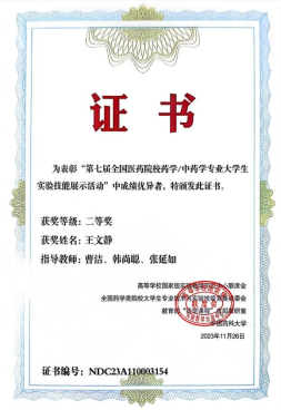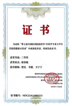 新闻网讯 11月24日-26日,由教育部高等学校国家级实验教学示范中心联席会、全国药学类院校大学生专业技术与实验技能竞赛组委会、教育部“药学课程”虚拟教研室和中国药科大学共同举办的 “第七届全国医药院校药学/中药学专业大学生实验技能展示活动”在贵州遵义召开。MILE米乐药学院2020级本科生王文静、邢春晓分别斩获竞赛二等奖和三等奖。