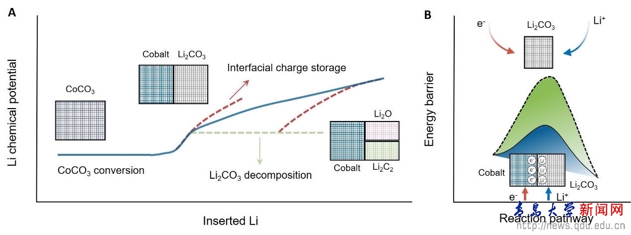 过渡金属和相关化合物由于其有趣的电子结构而在各种电化学反应中表现出高催化活性。鲜为人知的是,它们在电池电极中存储和转移电子方面的独特作用,电池电极经历额外的固态转化反应,并表现出相当大的额外容量。在这项工作中,研究人员在CoCO3/Li电池模型中揭示了在金属纳米颗粒存在下电化学界面的产生和演变的完整动态图像。除了在电池放电过程中传统地还原为Li2CO3/Co混合物之外,Li2CO3的进一步分解是通过从其相邻的Co纳米颗粒释放界面间存储的电子来实现的。这项工作的发现不仅可以启发下一代储能器件先进电极材料的发展,而且为揭示许多能量转换和存储系统中重要电催化机制提供了解决方案。