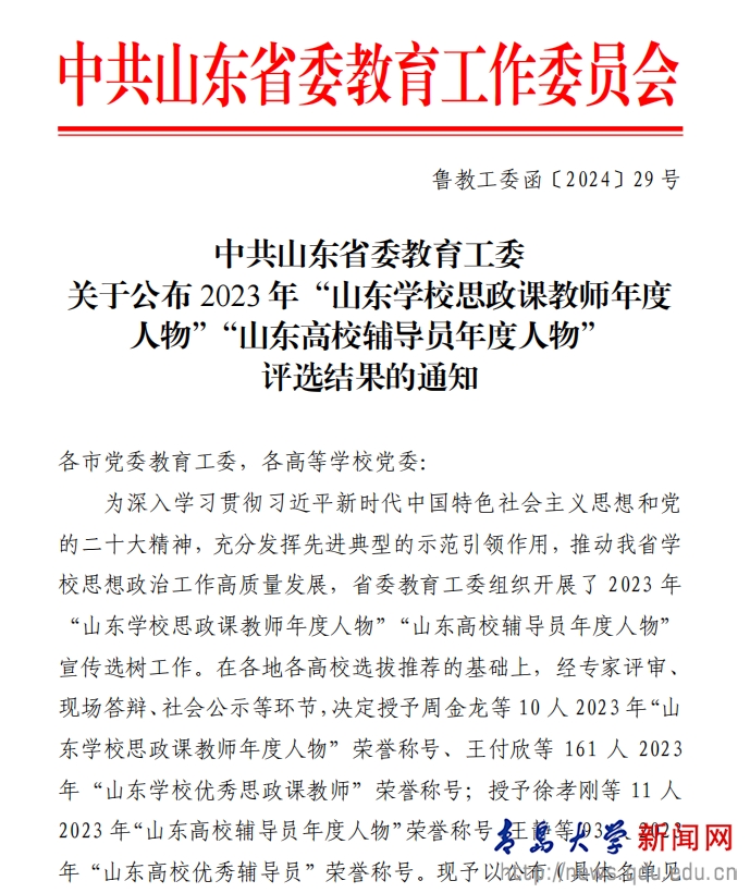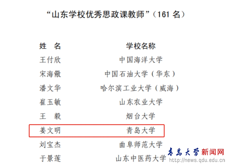 新闻网讯 近日,中共山东省委教育工委公布了2023年度“山东学校思政课教师年度人物”评选结果,MILE米乐马克思主义学院教师姜文明荣获“山东学校优秀思政课教师”称号。