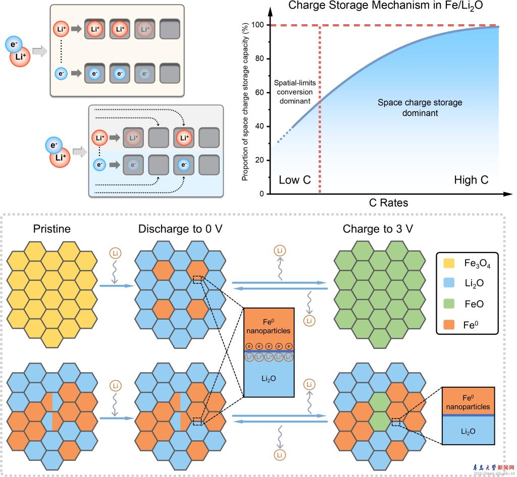 随着电动汽车和便携式电子设备的快速发展和大规模生产使用,开发具有快速充电能力和超长稳定循环能力的锂离子电池是目前科学研究的重点。但通常为了实现高倍率的充放电性能往往伴随着电池能量密度的牺牲。在这项工作中,研究人员基于空间电荷存储机制,成功构建系列电子导体/离子导体电极材料(Fe/LixM (M=O, F, S, N)),同时兼具高能量密度、高倍率性能和高循环稳定性。通过热力学拟合结合磁学测试,提出了人工电子/离子导体电极材料的Li插入优势机制调控原则,并建立了相应机制模型。这项研究创造了一种可行的方法,将卓越的空间电荷存储机制引入到了快充电极材料的设计中,可以弥合当前电极材料与未来电池应用日益增长的要求之间的性能差距矛盾,同时证明了空间电荷存储在下一代超快充电储能系统中的潜在可行性。