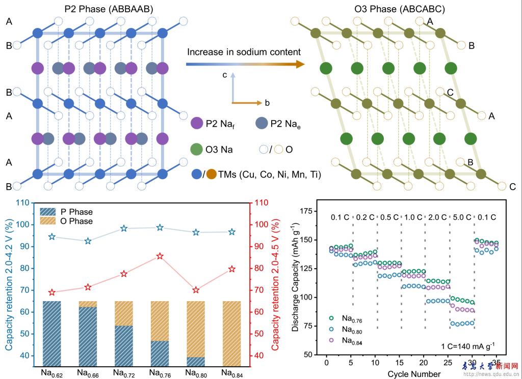 在众多钠离子正极材料体系中,层状过渡金属氧化物NaxTMO2具备高电化学性能且易于合成,得到了研究者们广泛的关注。与单相NaxTMO2材料相比,构建多相NaxTMO2正极材料能够通过激发不同相结构之间的协同作用有效稳定材料的结构,降低材料相变的程度,从而提升材料的电化学性能。但由于多相材料其固有的结构复杂性,缺乏对相组成变化和高电压下循环结构稳定性之间的深度理解,需要进一步探索并了解多相协同作用的内在机理。在本工作中,研究人员制备了一系列用于钠离子电池的双相层状氧化物NaxCu0.1Co0.1Ni0.25Mn0.4Ti0.15O2正极材料,通过物相表征、电化学测试、原位电化学表征和理论计算揭示了不同比例的双相结构对于材料高电压下结构稳定性的影响。与以往研究不同,该工作证实不恰当的双相结构可能比单相设计更具破坏性,合理的P2相和O3相比例对于维持材料结构稳定性和抑制不可逆相变至关重要。特别是,所研究的Na0.76Cu0.1Co0.1Ni0.25Mn0.4Ti0.15O2正极材料,其P2:O3=4:6的相比例在高电压和深度脱钠状态下表现出了优异的循环稳定性和电化学性能。此外,研究还发现在充电补偿过程中,阴离子氧化还原反应先于镍的氧化还原反应发生。通过结合实验和理论计算,该文章为开发具有先进性能的钠离子电池正极材料提供了新的见解和策略。