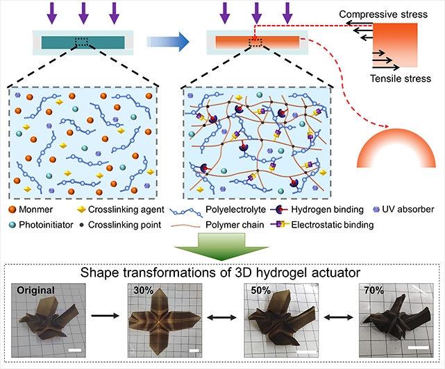 自变形水凝胶致动器在生物医学、软机器人、药物输送、生物传感器等领域具有巨大应用前景。水凝胶自变形能力源于其内部的各向异性微结构,传统构建策略只适用于2D自变形水凝胶致动器的构建,严重限制了其应用范围。近年来,如何实现3D自变形水凝胶致动器的构建成为该领域研究焦点。目前,科研工作者提出在构建2D水凝胶各向异性微结构的过程中同时引入空间分布内应力,通过该内应力释放将其转换为3D水凝胶致动器的构建思路。其中,内应力引入的关键是诱导水凝胶网络在聚合过程中自发收缩,然而,现有水凝胶自收缩机制引入的内应力较小、聚合物材料选择有限,无法用于高性能复杂3D结构的构建。