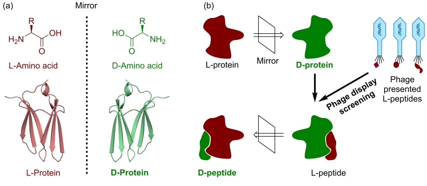 地球上已知的所有生物均具有“手性均一”的特征,生命所遵循的中心法则是建立在D-型DNA/RNA以及L-型多肽/蛋白质基础之上。作为支撑地球生命运动的关键物质,天然多肽和蛋白质几乎均由L-型氨基酸组成(注:甘氨酸没有手性)。迄今为止,还没有证据表明镜像多肽和镜像蛋白质在生命进化中曾经出现过。很长一段时间内,科学家对多肽和蛋白质的研究聚焦于L-型多肽和L-型蛋白质。然而,与天然L-型多肽和L-型蛋白质相比,由D-氨基酸组成的镜像多肽和镜像蛋白质具有独特的结构和功能,使其具有更高的稳定性和更低的免疫原性。