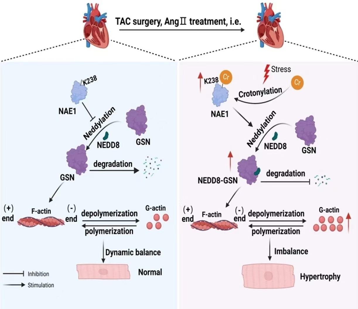 该研究揭示了NAE1的巴豆酰化修饰在病理性心肌肥厚中的作用。NAE1 K238的巴豆酰化修饰可通过调控GSN的类泛素化修饰影响其蛋白的稳定性及表达,进而通过影响肌动蛋白的解聚活性及细胞骨架的重塑参与病理性心肌肥厚的进展,为心力衰竭的治疗提供新的思路与潜在靶点。