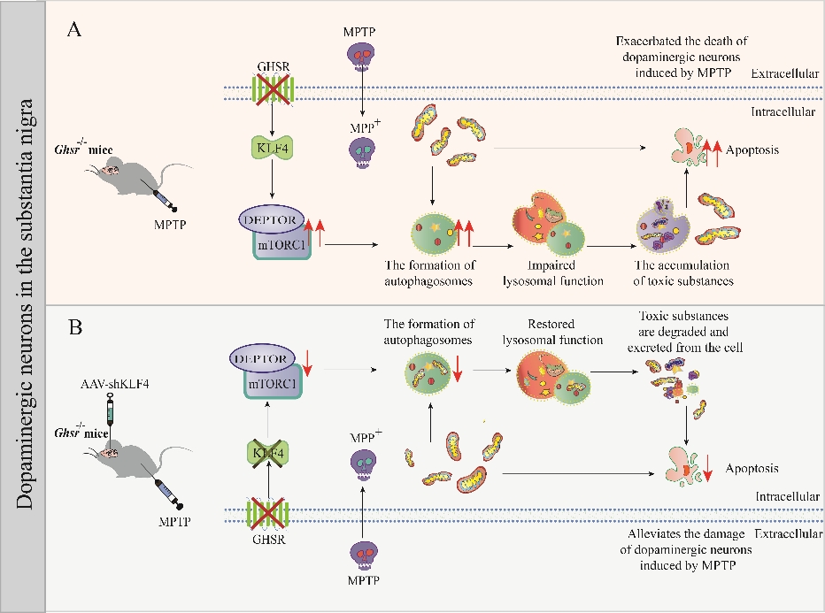 帕金森病是多发于中老年人的神经系统退行性疾病。该课题组前期研究发现,外源性给予ghrelin可通过激活生长激素促分泌素受体(GHSR)在帕金森病中发挥神经保护作用。课题组在该研究中观察到GHSR敲除后能够加剧MPTP诱导的帕金森病小鼠模型黑质多巴胺能神经元损伤,具体机制表现为GHSR敲除可增加KLF4的表达,进而转录调节mTORC1的DEPTOR亚基,导致自噬的持续激活和溶酶体功能障碍,从而抑制受损线粒体的清除。同时,敲低KLF4后可有效逆转上述过程,抑制黑质多巴胺能神经元损伤。该研究阐明了内源性GHSR在维持多巴胺能神经元功能中的重要作用,为帕金森病的治疗提供了新的靶点和实验依据。