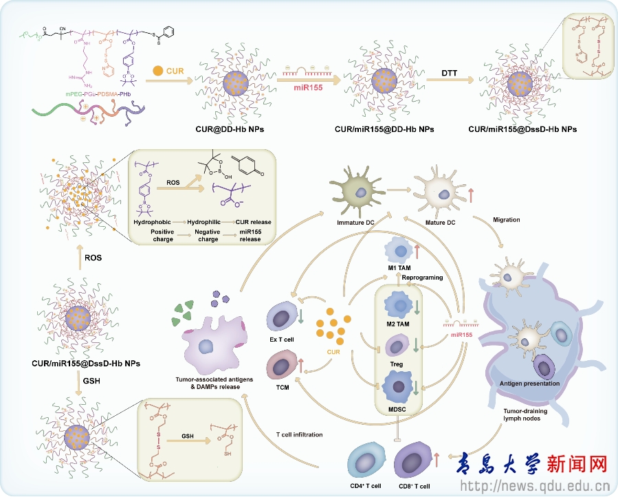 新闻网讯 近日,基础医学院医学药理学系陈雪红课题组在《Journal of Nanobiotechnology》(IF=10.2,中科院1区)发表题目为 “Reactive oxygen species/glutathione dual sensitive nanoparticles with encapsulation of miR155 and curcumin for synergized cancer immunotherapy”的研究论文( DOI:10.1186/s12951-024-02575-5)。该论文由基础医学院医学药理学系研究团队完成,博士研究生李康康为第一作者,陈雪红教授为通讯作者,MILE米乐官方网站基础医学院为第一署名单位,该研究受到山东省自然科学基金资助。