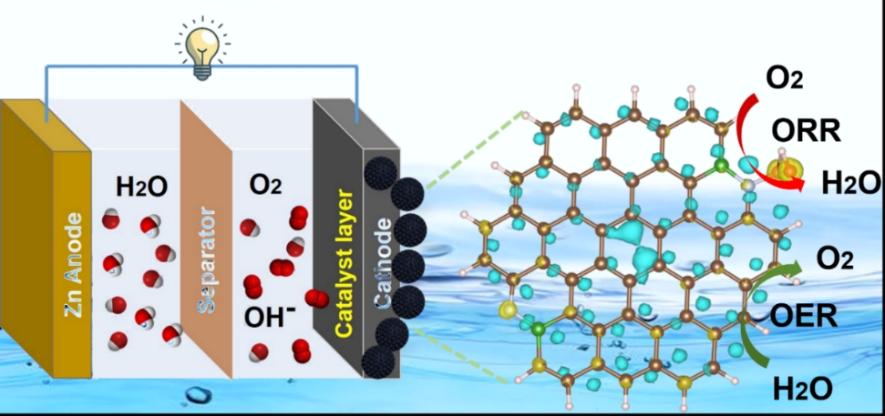 金属-空气电池作为解决能源转换和储存问题的替代方案,其效率受到氧还原反应(ORR)和氧析出反应(OER)缓慢反应动力学的制约。鉴于低储量、高成本铂基电催化剂使用的局限性,碳材料具有成本低、高机械强度、优良导热性和导电性以及轻质等优势,开发低成本、高效无金属碳基双功能电催化剂具有重要意义。为此,该工作通过硬模板法和物理活化法相结合策略,对碳基电极实现宏观-微米-纳米级多尺度结构调控,获得有序分级孔结构与表面氮硼共掺杂基团结构协同优化,并有效调控了活性位点分布和局域电子环境。相比大多数碳基电催化剂,制备的富有序分级孔氮硼共掺杂碳微球电催化剂在锌-空气电池中实现了更高的电催化活性(ORR:起始电位0.996 V,半波电位0.889 V;OER:10 mA cm−2下过电位384 mV)与稳定性(长航时连续充放电358 h)。此外,该工作通过密度泛函理论(DFT)模拟揭示吡啶型N-B配对在邻近N活性位点上的高效电子转移途径和OOH*吸附物种的转换机制,为设计和优化碳基电催化剂的多杂原子配组与有序分级结构提供了新见解。