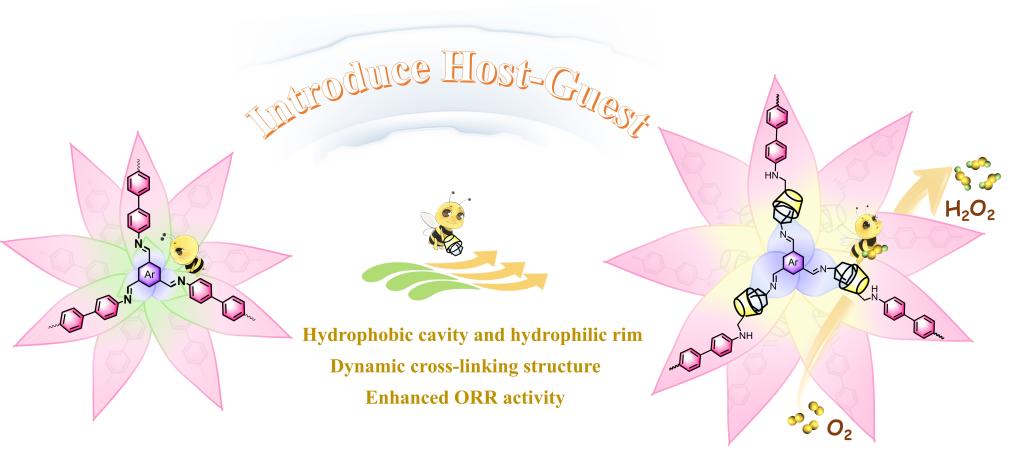 过氧化氢(H2O2)是一种高价值化学品,广泛应用于能源储存、污水处理、卫生消毒和纸浆漂白等领域。目前,H2O2的工业生产主要依赖于废弃物密集型的蒽醌氧化工艺,这不仅引发环境问题与严重的安全隐患,还伴随着昂贵的催化剂成本和巨大的能源消耗。电化学氧还原反应(ORR)因其温和的水反应环境及能够利用绿色电力作为能源输入,而被视为一种清洁生产H2O2的有效途径。非金属碳基材料被认为是商业化的贵金属基电催化剂的最有前途的替代品,但它们在实现高产物浓度与生产效率方面仍面临着巨大挑战。超分子聚合物,凭借其独特的分子识别能力和动态交联特性,在催化领域展示出了巨大潜力。然而,针对高效氧还原制过氧化氢的超分子电催化剂少有研究。因此,设计具有高效选择性和ORR活性的超分子氧还原电催化剂用于H2O2合成尤为迫切和重要。
