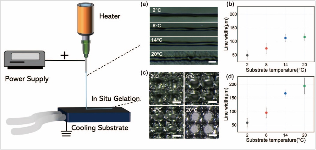 生物材料的空间结构直接影响其植入人体组织后的功效或成败。因此,实现精度高、生物相容性好的打印技术成为新一代生物材料创制领域的重要焦点。针对常用挤压式打印和铸造等技术分辨率低、复杂生物材料结构打印难的挑战,肿瘤院医工团队创造性地将溶胶-凝胶相变原理与电流体动力(EHD)打印技术有机融合,同时完成"液态沉积-基底瞬态凝胶化"技术的突破,最终成功构建新型“溶胶-凝胶电动力直写打印技术”(Sol-Gel Electrohydrodynamic Direct Writing, SGEHD)。