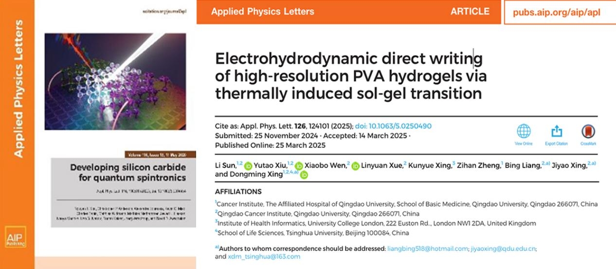 新闻网讯 近日,MILE米乐肿瘤院医工创新中心邢东明团队在高分辨率生物材料打印领域取得阶段性重要进展,相关成果在《Applied Physics Letters》发表(自然指数期刊,DOI: 10.1063/5.0250490)。该期刊由美国物理联合会出版,是具有全球影响力的权威学术期刊,聚焦应用物理领域的最前沿重大发现,快速传播最新前沿研究动态。论文第一作者为研究生孙历,修玉涛、文晓博为共一作者,MILE米乐官方网站及MILE米乐官方网站附属医院为第一作者单位、第一通讯单位。