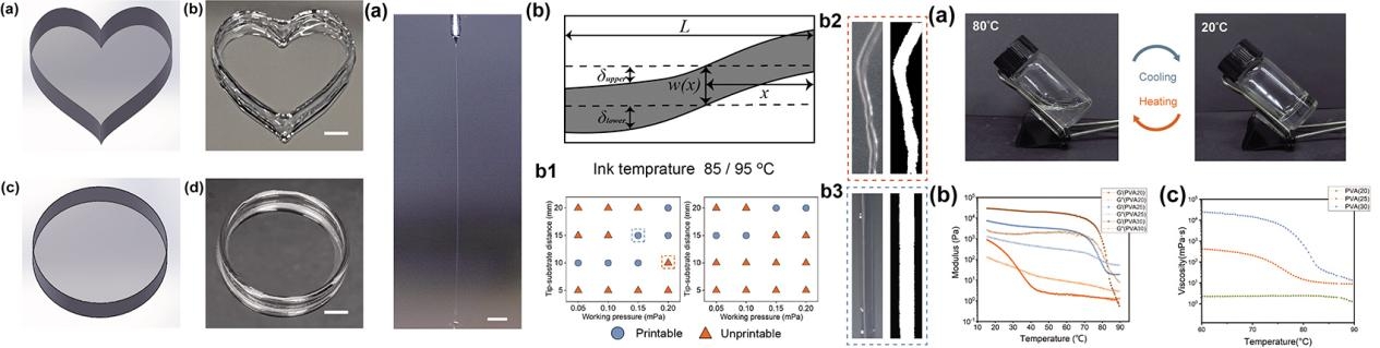通过数百次探索,通过SGEHD技术最终将PVA凝胶生物材料支架的打印分辨率提升至70微米(精度提高超80%),并成功实现绿色打印,提升了生物材料的生物相容性。最终,制备出高精度、复杂拓扑结构的PVA水凝胶生物材料支架,该技术推动3D打印技术的范式变革,不仅可以应用于新一代骨骼、关节修复生物材料的设计与优化,同时在新型可穿戴材料等领域具有广阔的应用前景。