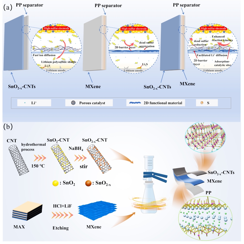 该研究主要针对高能量密度锂硫电池存在的多硫化物穿梭效应和硫氧化还原动力学缓慢的问题,提出了一种新颖的双梯度隔膜功能化设计策略,利用富含氧空位的一维SnO2-x修饰碳纳米管(SnO2-x-CNTs)作为上层催化/吸附层和二维MXene(Ti3C2)作为下层物理屏障层,通过二者协同,精准调控LiPSs的反应界面。氧化锡空位的生成使Sn的p带中心向费米能级移动,从而实现LiPSs的吸附-捕获-转化过程,提高锂硫电池的循环稳定性和倍率特性。