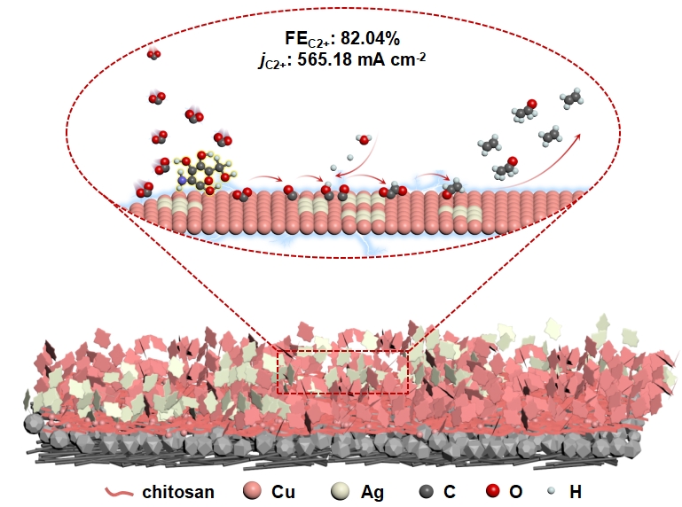 电催化转化CO2制备重要化学品具有碳资源合理利用与环境保护的双重意义,本研究构建了一种具有Cu-Ag双位点的三维GDE(3D-CuAg-GDE),用于电催化CO2还原制备C2+产物。该电极在-0.88 V vs. RHE下实现了82.04%的C2+法拉第效率,部分电流密度达到565.18 mA cm-2,且在500-900 mA cm-2的宽电流范围内仍能保持近60%的C2+选择性。实验与理论分析表明,壳聚糖诱导生长的三维结构提高了活性位点利用率和CO2传质效率,其与CO2分子间形成的氢键促进了CO2的富集与吸附。密度泛函理论(DFT)计算表明,*CO中间体能够从Cu位点迁移至Ag位点,有效降低*CO加氢活化能,促进Cu吸附的*CO与Ag结合的*CHO物种之间发生耦合反应。这项工作阐明了双位点协同作用对C2+产物生成的影响,并为设计高效GDE以实现安培级CO2电解提供了新的见解。