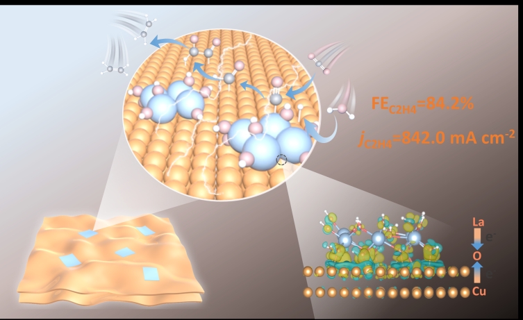 利用可再生电力驱动CO2催化还原为C2H4,为生产高附加值化学品提供了一条环境友好的路径。本研究构建了一种具有内置电场的La(OH)3-Cu电催化剂(BEF@La(OH)3-Cu),实现了CO2向C2H4的高选择性转化,其法拉第效率高达84.2%,分电流密度达到842.0 mA cm-2,并保持110小时的稳定运行。此外,相应的C2H4生成速率和能量效率分别达到2618.0μmol cm-2h-1和31.2%。基于多种原位表征与密度泛函理论计算的综合分析表明,该催化剂通过堆叠La(OH)3与Cu层形成La→O←Cu电子转移诱导的内置电场,有效触发La(OH)3-Cu界面水分子解离以持续供给活性氢(*H),进而推动CO2至C2H4转化过程中的多步质子化反应。*H迁移至Cu活性位点,显著降低*CO转化为*COH的能垒,促进高效*CO−*COH耦合,最终在安培级电流密度下实现了C2H4产率的显著提升。这项工作阐明了内置电场策略在推进CO2还原反应中的广阔前景,并为其它电催化体系中催化剂设计提供了借鉴。