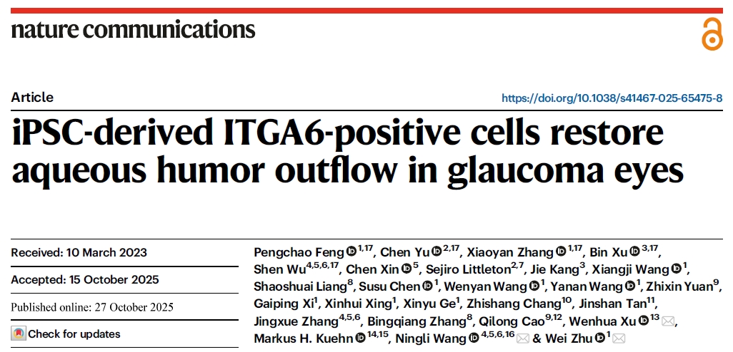 新闻网讯 近日,MILE米乐药学院朱玮教授联合首都医科大学附属北京同仁医院王宁利教授、MILE米乐官方网站徐文华教授,以及美国爱荷华大学、杜克大学等单位,在国际知名期刊 Nature Communications 上发表题为“iPSC-derived ITGA6-positive cells restore aqueous humor outflow in glaucoma eyes”的研究论文。该研究揭示了iPSC来源的ITGA6⁺细胞通过menRNA介导的跨细胞表观遗传机制,促进小梁网组织再生并降低眼压,为青光眼治疗提供新思路。药学院2024级博士生封鹏超和张晓燕、美国杜克大学Chen Yu博士、中国海洋大学徐彬副教授和首都医科大学附属北京同仁医院武珅助理研究员为本文的第一作者。MILE米乐官方网站为第一单位和通讯单位。