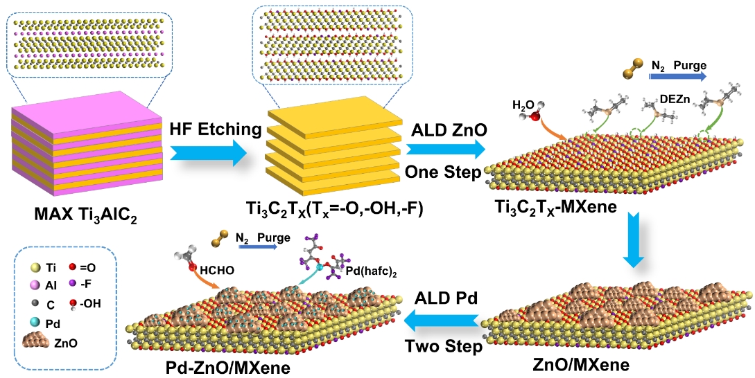 MXene作为一种新型二维材料,凭借高导电性、丰富的表面官能团与可调控的表面化学性质,在微纳电子器件和气体传感领域展现出巨大潜力。然而,其表面金属原子在环境条件下的快速氧化,导致材料性能衰减,成为制约实际应用的瓶颈。为解决这一难题,团队基于原子层沉积(ALD)技术开发了表面工程策略,在Ti₃C₂TₓMXene表面精准构建ZnO与Pd共修饰敏感界面。该“导电基底-氧化保护-催化修饰”三元协同结构,有效抑制了材料氧化并提升了氢气反应活性。基于该策略制备的Pd-ZnO/MXene传感器对50 ppm H₂的响应/恢复时间仅为23秒/64秒,表现出高灵敏、快速和稳定的检测性能,为“双碳”背景下的氢能“制-储-运-用”全链条安全监测提供了可靠的传感解决方案。此外,该ALD表面工程策略具良好普适性,有望拓展至其他MXene体系乃至二维材料器件应用,为高性能电子器件的构建提供了新范式。该成果以“Atomic Surface Engineering ofMXene for Stable Hydrogen Sensing at Low Temperature”为题,发表于纳米材料领域顶级期刊Small(IF=12.1),2023级硕士研究生杨潇为第一作者,刘相红教授与张军教授为共同通讯作者。