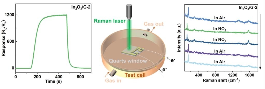 针对半导体气体传感器敏感过程中活性物相不明、动态机理不清的核心挑战,团队利用石墨烯诱导成功制备了物相可调In₂O₃同质结构,并创新性地采用原位拉曼光谱技术,首次实现了对气体响应过程中材料表面物相动态变化的实时观测。该研究不仅使传感器对5 ppm NO₂的响应提升至1208,灵敏度提高20倍以上,更关键的是通过捕捉特征拉曼峰的可逆变化,明确了主导气敏行为的活性物相,建立起从纳米尺度结构动力学到宏观器件功能的直接关联,为高性能、低功耗气体传感器的理性设计提供了坚实的理论与实验基础。该成果以“Probing the Structural Dynamics of In2O3Using in Situ Raman Spectroscopy: Bridging Material Dynamics and Sensor Functionality”为题发表于化学领域顶级期刊Angew. Chem. Int. Ed.。2023级博士研究生赵娜与常晓副教授为共同第一作者,刘相红教授和张军教授为共同通讯作者。