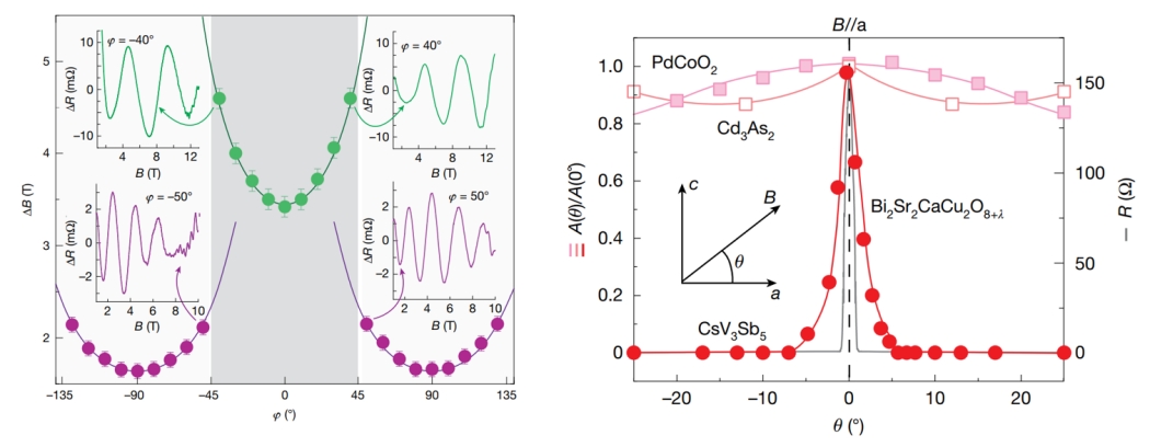 本工作在CsV3Sb5的层间电输运信号中发现了30 K以下正比于磁场且周期为h/e的磁电阻振荡。其对磁场的角度依赖关系以及较短的平均自由程均与同样表现出h/e振荡的高电导率金属PdCoO2不同,表明单粒子图像难以解释这一现象。这些发现指向了一种宏观相干的集体电子态,其相干特性类似于超导电性,但缺乏无耗散凝聚。本工作确立了笼目金属体系作为实现和探索相干电子态的优越平台,展示了利用几何结构、磁阻挫或电子相互作用实现量子相干性的全新途径,为实现新型高温量子干涉器件开辟了新的方向。