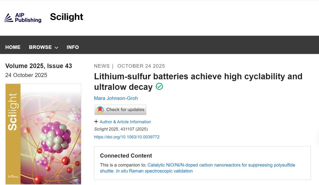 新闻网讯 近日,物理科学学院刘相红教授团队在自然指数期刊Applied Physics Letters发表题为“Catalytic NiO/Ni/N-Doped Carbon Nanoreactors for Suppressing Polysulfide Shuttle:In-situRaman Spectroscopic Validation”的研究论文。该研究成果被编委会推荐为Featured Article,并被美国物理学联合会《科学之光》(Scilight)专访报道。