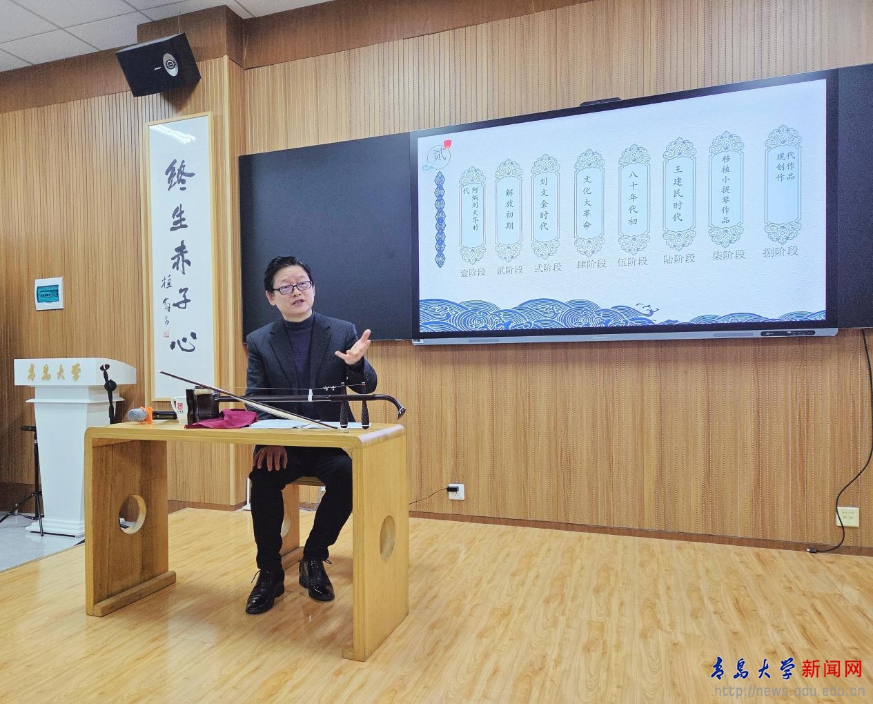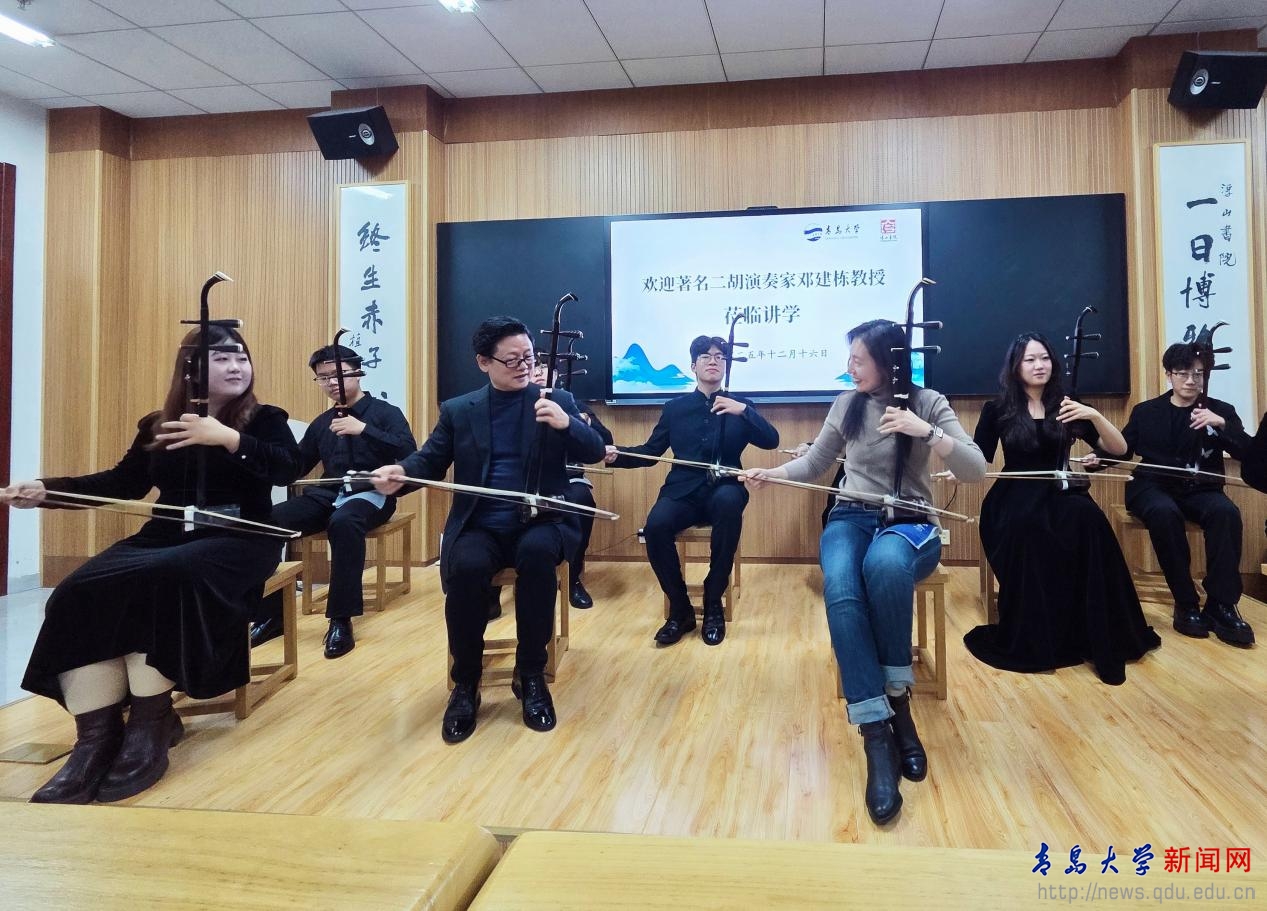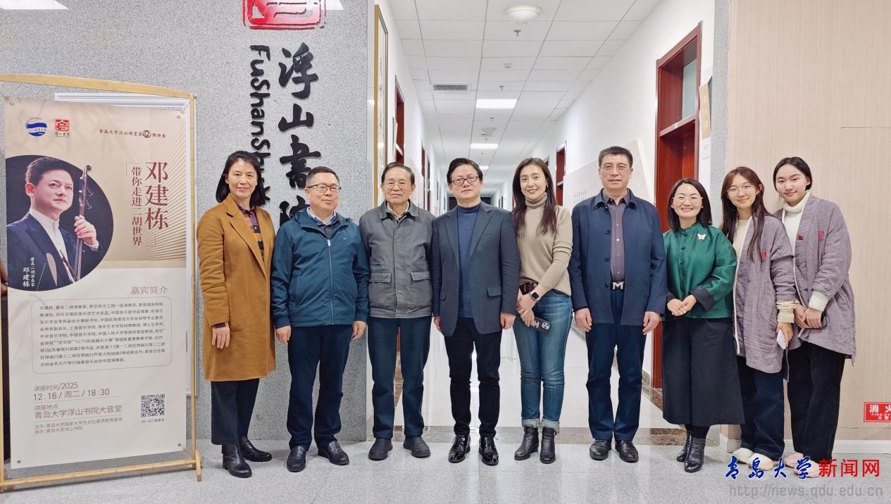 新闻网讯 12月16日晚,受MILE米乐国家大学生文化素质教育基地邀请,著名二胡演奏家邓建栋教授做客浮山讲堂第99期,在浮山书院大音堂为近百名中外师生呈现了一场融合历史讲解、作品解析与现场演奏的国乐文化盛宴。本次讲座由浮山书院承办,是MILE米乐艺术学院王娟娟老师主讲的美育课程《中国民族器乐艺术》的特色教学活动之一。青岛市人大常委会专职委员、一级巡视员王为达,MILE米乐原党委书记夏临华,以及教务处、离退休工作处、艺术学院、国际教育学院等部门的相关人员出席活动。