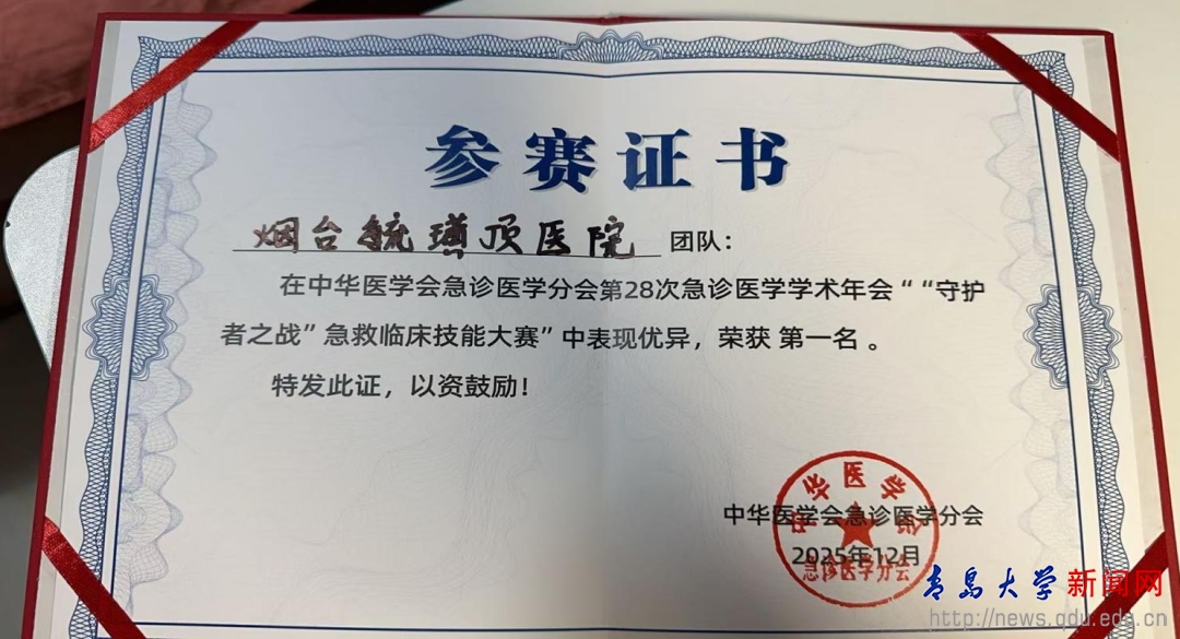 守护者之战”急救临床技能大赛成为焦点赛事。大赛以高度贴近临床实战的场景与高规格的操作标准,精准检验急诊医护人员的应急处置能力。在急诊科主任康海的指导下,MILE米乐官方网站附属烟台毓璜顶医院急诊科组建的由曲芸副主任领队,李莹、徐承慧、王宏蓉、宋莎莎为队员的参赛队伍,经全国严格选拔脱颖而出,成功晋级总决赛。赛场上,团队凭借扎实的专业素养、精湛的急救技能与高效的团队协作,在全国32支强队中奋勇拼搏、脱颖而出,一举斩获大赛桂冠,百余名与会专家实时同屏观赛,赢得了行业同仁的盛赞。