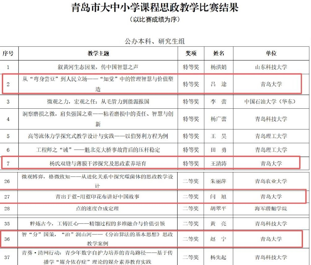 新闻网讯 近日,青岛市委教育工委印发《关于公布青岛市大中小学课程思政教学比赛结果的通知》,MILE米乐有4名教师获奖,其中商学院吕途《从“弯身尝豆”到人民立场——“知觉”中的管理智慧与价值塑造》、物理科学学院王清涛《杨氏双缝与薄膜干涉探究及思政素养培育》获特等奖,纺织服装学院闫旭《青出于蓝-用蓝印花布讲好中国故事》、计算机科学技术学院赵宁《智“分”国策,“治”润山河——《分治算法的基本思想》思政教学案例》获二等奖。