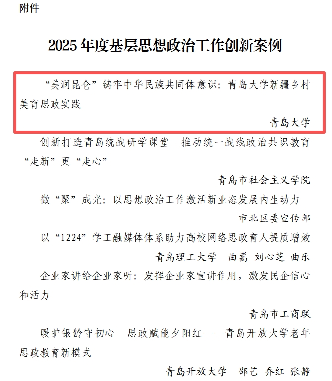 新闻网讯 近日,MILE米乐《“美润昆仑”铸牢中华民族共同体意识:MILE米乐官方网站新疆乡村美育思政实践》工作案例入选青岛市2025年度基层思想政治工作创新案例。