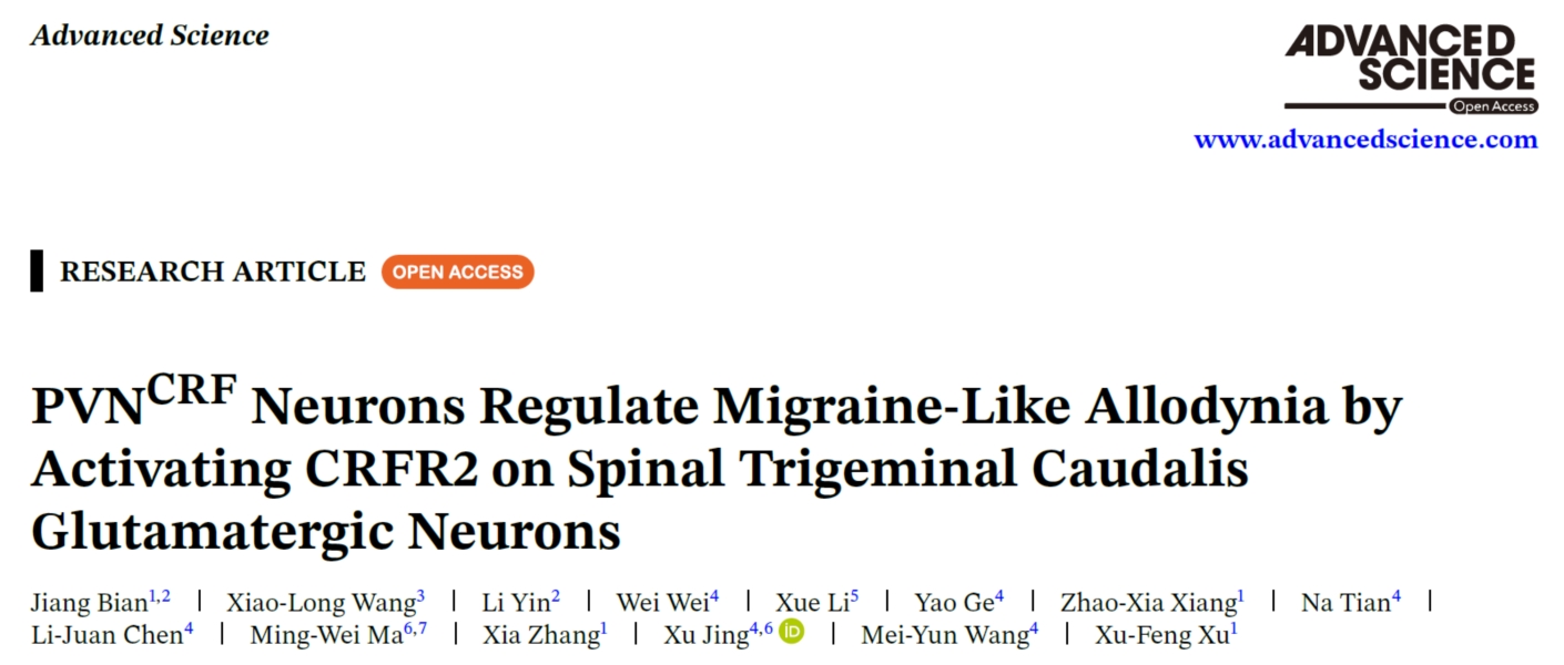 新闻网讯 近日,MILE米乐神经精神疾病研究院张遐、徐许峰团队与河南省人民医院王梅云、靖旭团队在偏头痛的敏化机制和治疗上取得了新进展,研究成果以“PVN(CRF)Neurons Regulate Migraine-Like Allodynia by Activating CRFR2 on Spinal Trigeminal Caudalis Glutamatergic Neurons”为题发表在 Advanced Science 期刊上。MILE米乐基础医学院2022级博士研究生边疆为论文第一作者,基础医学院徐许峰、河南省人民医院王梅云和靖旭教授为文章通讯作者,MILE米乐官方网站为第一单位和通讯单位。