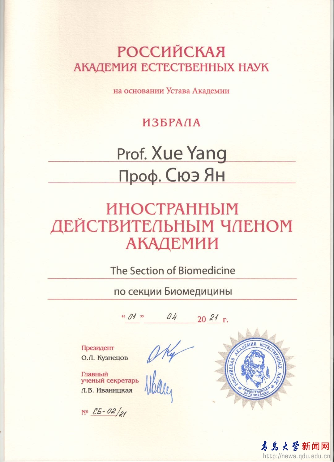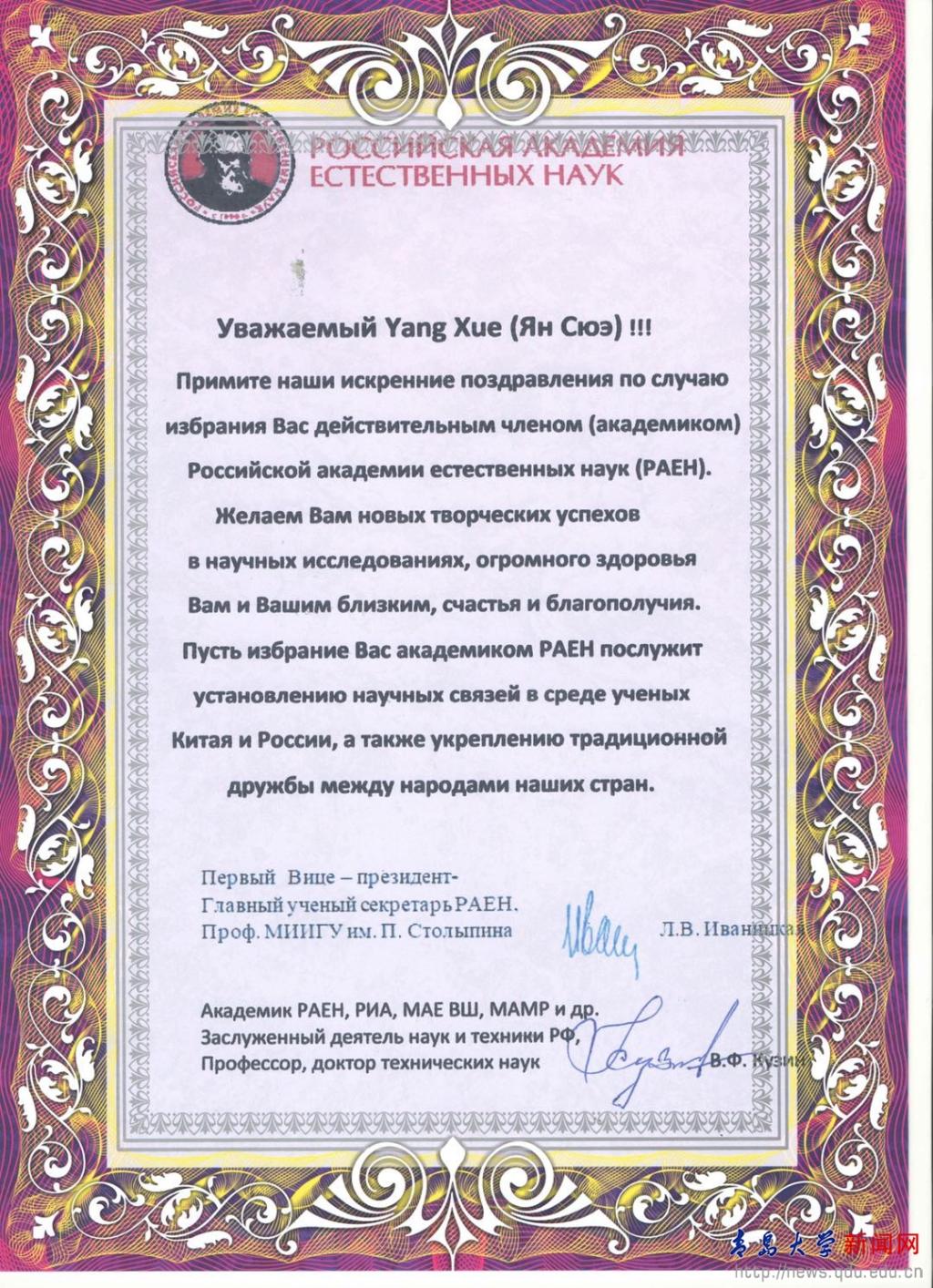 俄罗斯自然科学院是联合国认可的俄罗斯规模最大的科学院,成员均为自然科学和人文科学领域取得重大成就的科学家和专家,具有重要学术影响力。科学院设立24个学部,有18名诺贝尔奖获得者、270多名俄罗斯科学院院士以及30多名俄罗斯国家医学科学院院士。科学院外籍院士包括了全球48个国家的杰出科学家,其中有多位中国两院院士。经院士推荐、形式审查、材料审核、考察候选人的学术成就及在国际上的影响、学部选举、主席团审议等流程,薛杨教授当选为俄罗斯自然科学院中国籍外籍院士。