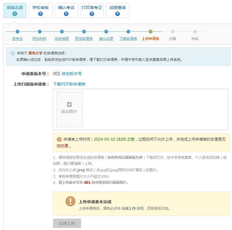 (三)请考生务必于2024年5月10日下午17:00前完成上述报名流程。凡是材料不全、未按要求上传、系统未最终提交的视为放弃报名资格。