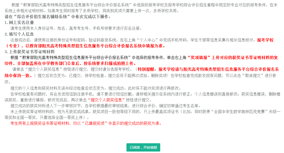 请在“教育部阳光高考特殊类型招生信息服务平台综合评价报名系统”完成学校报名后,再进行获奖证书等证明材料的上传。报考学校(专业),以教育部阳光高考特殊类型招生信息服务平台综合评价报名系统中填报为准。