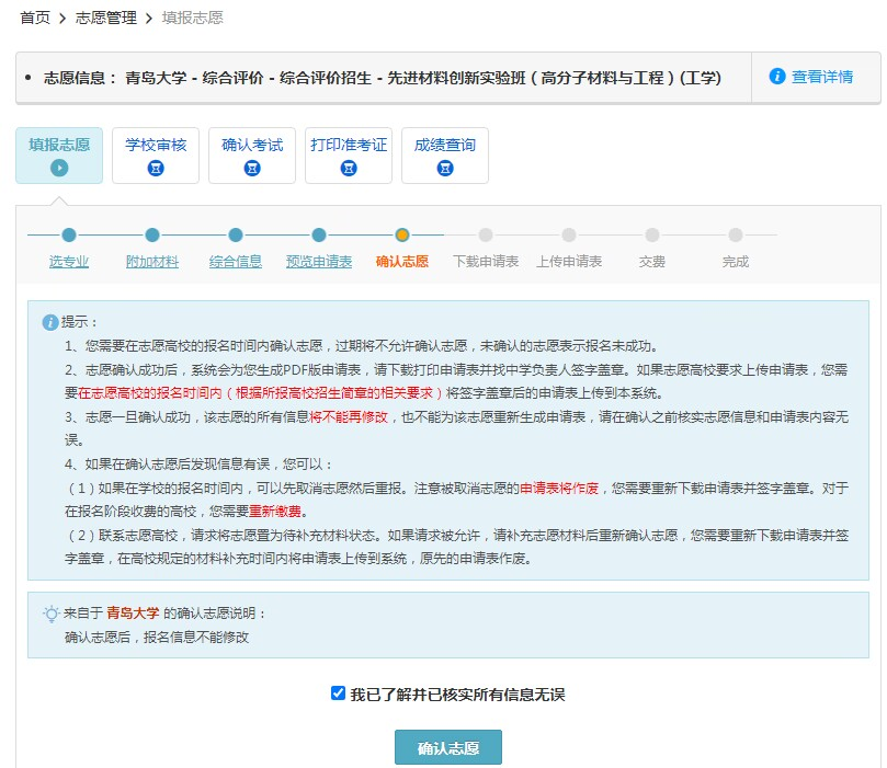 预览申请表后,进行确认志愿