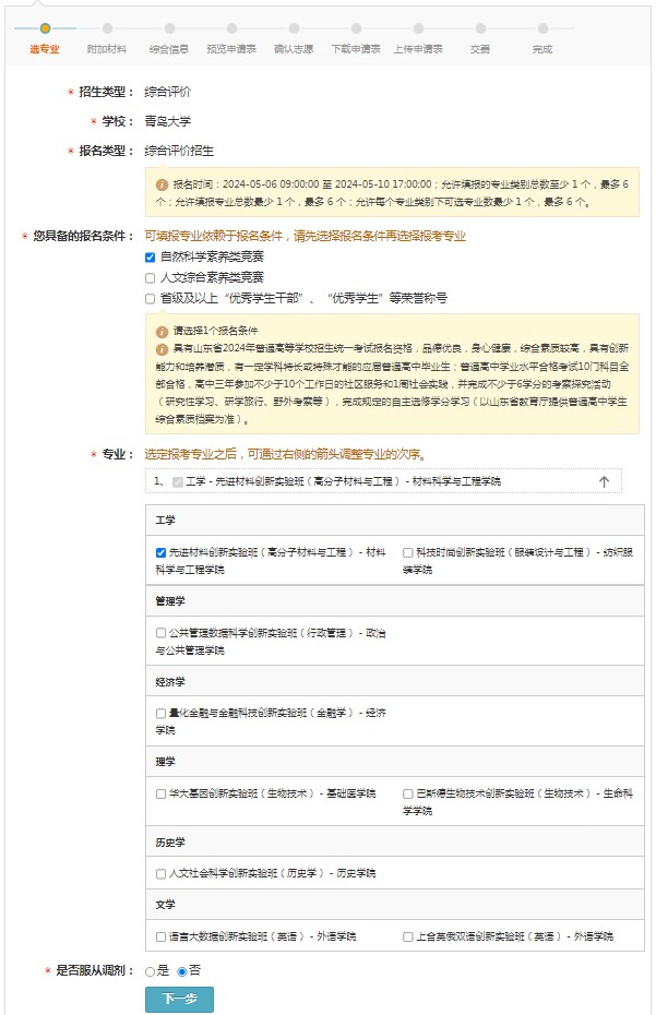 选择符合选考科目要求的专业,最多选择6个,请选择是否服从调剂。