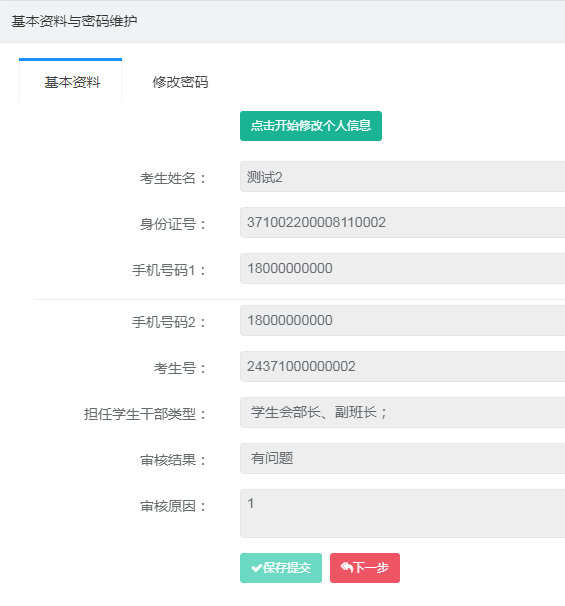 (五)在系统右上角“个人中心”中完成手机号码、学生干部等信息采集与相关信息核对与修改,完成后保存提交,点击下一步,进行奖项填报。