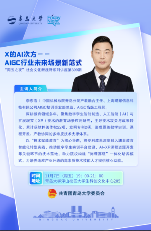 主讲人简介:中国机械总院青岛分院产教融合主任、上海琨耀信息科技有限公司AIGC培训事业部总监,AIGC高级工程师。主要聚焦数字孪生智能制造、人工智能(AI)与扩展现实(XR)技术的教育场景应用研究,主导技术攻关与成果转化,累计获软件著作权22项、发明专利2项,形成覆盖教学实训、课程开发、产教协同的多维度技术支撑体系。以“技术赋能教育”为核心导向,推动数字孪生实训平台建设、AI+XR课程资源开发等关键环节的技术落地,助力院校构建“岗课赛证”一体化培养模式,为培养适应产业升级的高素质技术技能人才提供核心动能。