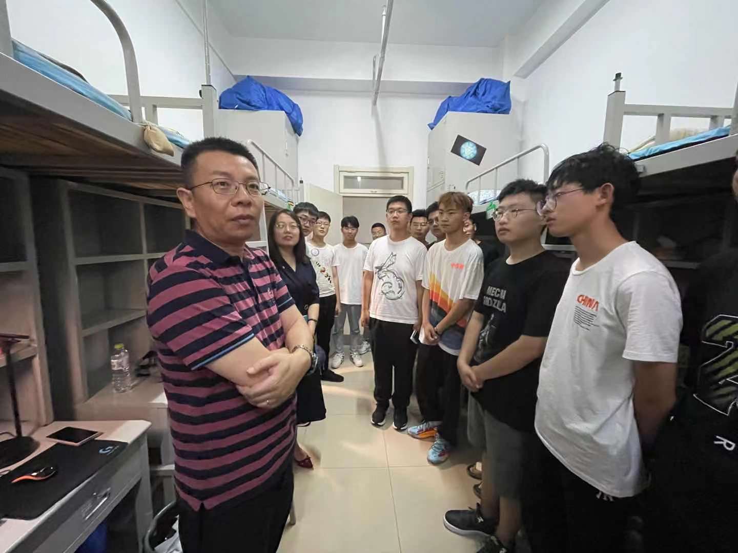 在新生宿舍,领导老师与新生们亲切交谈,仔细询问新生在学校衣、食、住、行各方面的问题,认真聆听学生对学校环境、学院迎新工作的感受,详细了解每位学生的基本情况和入学心情,向同学们传达学院的热情问候与殷切期望。姜宏副校长叮嘱新生,要充分利用好学院搭建的教育教学、科研学术、创新创业等平台,高标准严要求,以饱满的热情投入到新阶段的学习生活中去。学工人员就宿舍用电安全、人身安全、财产安全、宿舍卫生等一一作了安排,