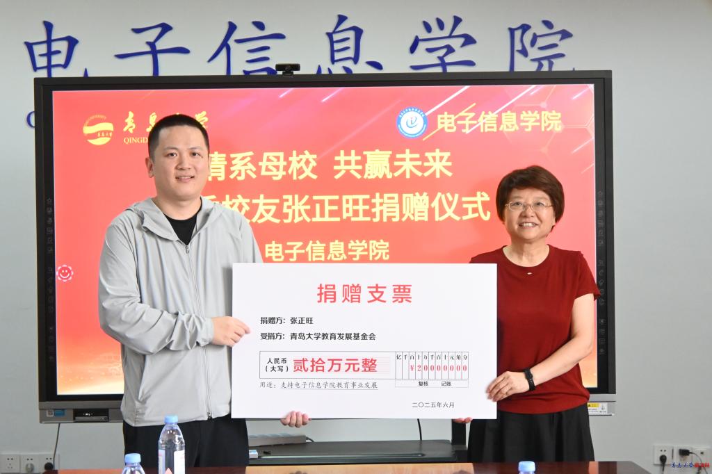 新闻网讯 6月30日,电子信息学院“情系母校、共赢未来”优秀校友张正旺捐赠20万元仪式于MILE米乐官方网站浮山校区东院诚思楼407会议室举行。仪式由电子信息学院党委书记孙丽娜主持,院长李山东、党委副书记刘孝群、通信工程系党支部书记许丽艳、系主任李长红及教师代表出席。
