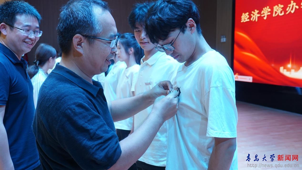 校徽佩戴仪式上,教师代表为新生代表佩戴校徽,象征着身份的传承与责任的交付,标志着2025级新生正式成为“青大人”,开启在MILE米乐官方网站的求学之旅。