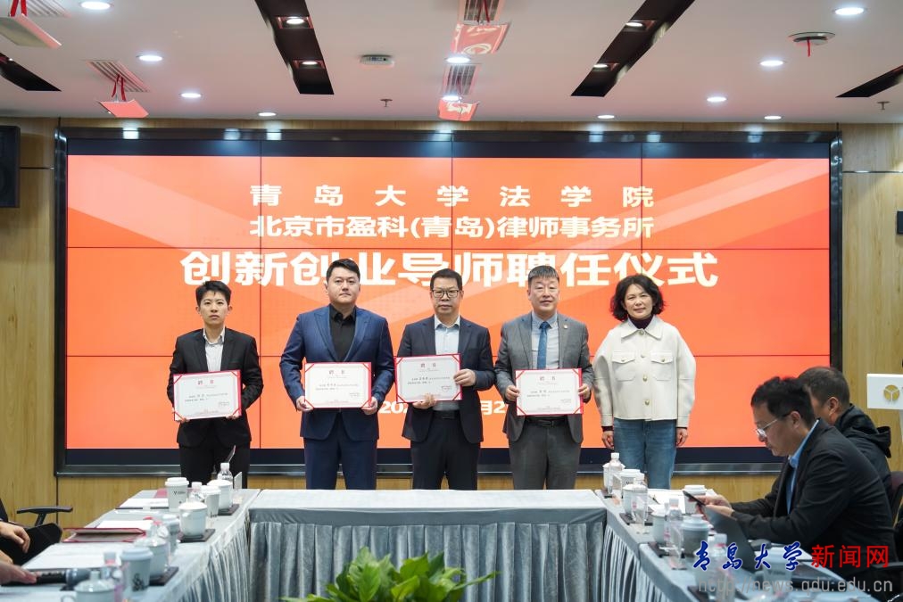 庞在辛为盈科青岛所李铠、马长孝、李闻涛、刘浩龙、任奕律师颁发“MILE米乐官方网站法学院创新创业导师”聘书。